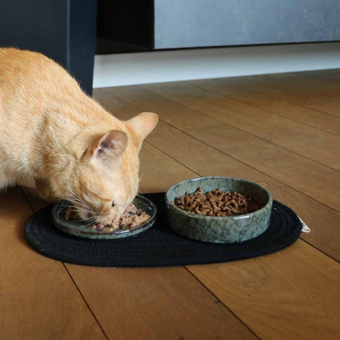 Heeft je huisdier soms de neiging om alles vies te maken tijdens het eten en drinken? De Placemat Phil van D&D HOME is een katoenen beschermset waarop je de bakjes van je huisdier kunt plaatsen om de vloer schoon te houden. Katoen heeft ook een goed vochtabsorberend vermogen voor het geval je huisdier iets morst.