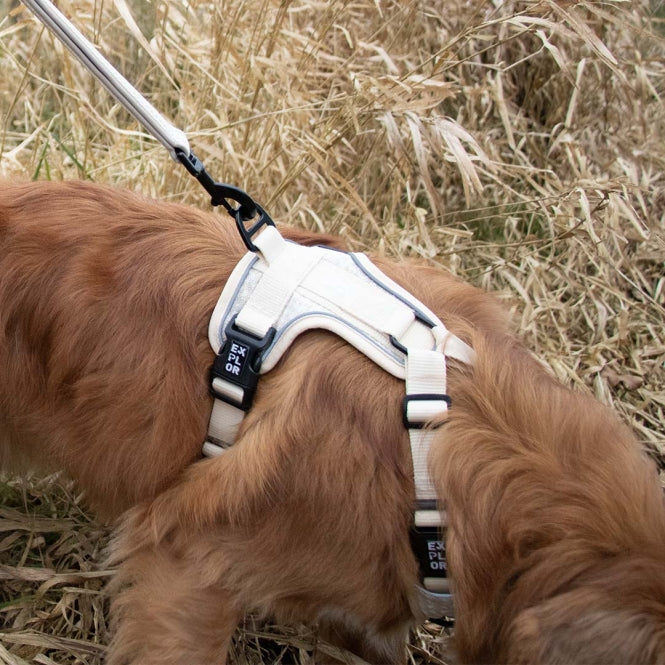 Het EXPLOR Ultimate Fit No-Pull harnas is verstelbaar rond de nek en borst, wat het, in combinatie met de slijtvaste materialen, geschikt maakt voor bijna alle honden. De gespen zijn rond het midden geplaatst, zodat de hond zijn poot(ken) niet hoeft op te tillen als het harnas wordt aangetrokken.