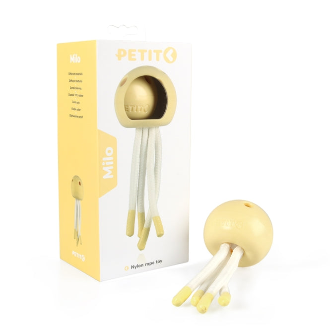 Het Milo-speeltje van PETIT is een kauwspeeltje voor puppy's en kleine honden. De draaiende tentakels zijn gemaakt van duurzaam nylon. Wanneer de hond erin bijt, heeft dit een kalmerend effect en helpt het de tanden schoon te houden. De tentakels hebben rubberen uiteinden waar honden ook graag op kauwen. Milo's ronde, elastische rubberen kop zorgt voor een goede grip tijdens het spelen. De pastelkleur van Milo is een van de weinige kleuren die honden kunnen waarnemen.