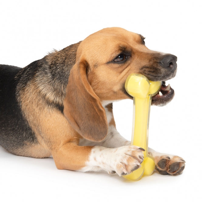 Duurzaam hondenspeelgoed. Het bot is geel en ruikt heerlijk naar kokos.